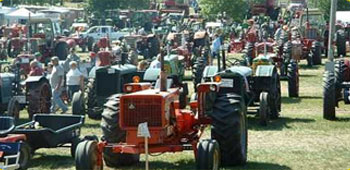 Stack threshing and horse power threshing * Horse powered well drilling * Plowing * Straw baling * corn shredding and shelling * Cutting and binding corn * Silage cutting * Heavy duty earth moving equipment * Antique and classic tractors * Sawmill * Veneer, shingle, and lathe mills * Lumber planner * Ye Ol’ wood shop * Gas engine grove * Miniatureland * Steam engines * Huge stationary steam and diesel engines * Full size blacksmith shop * Huge tractor pull * Teams of horses * Antique cars and trucks * 1859 Log cabin *
